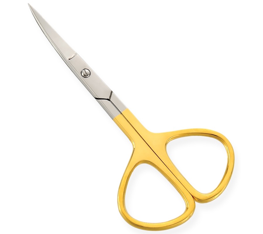 Available Sizes. 3.5 in Details. All scissors are made of superior quality stainless steel 410, HRC° (hardness) 45° - 48°. Available in Blister Packing, Pouches and Plastic Bags. Nail Scissors Half Gold Platted Curved, Adjustable Screw