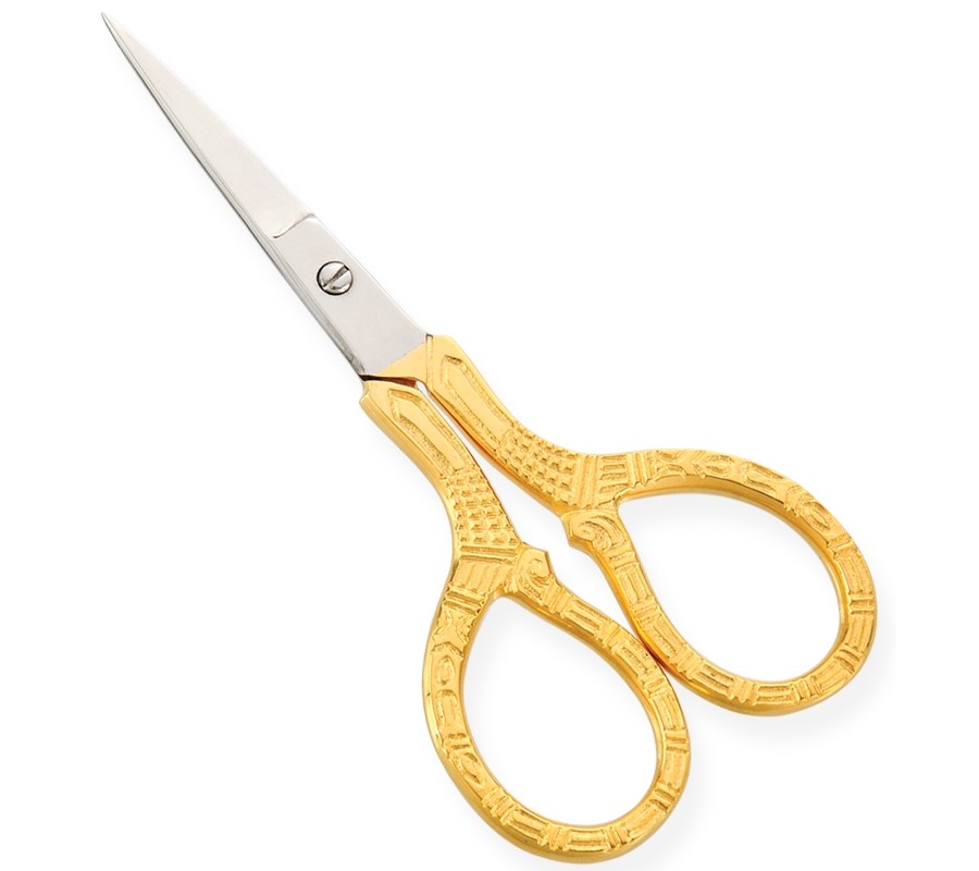 Embroidery Scissors Half Gold Platted Available Sizes. 4 in Details. All scissors are made of superior quality stainless steel 410, HRC° (hardness) 45° - 48°. Available in Blister Packing, Pouches and Plastic Bags.