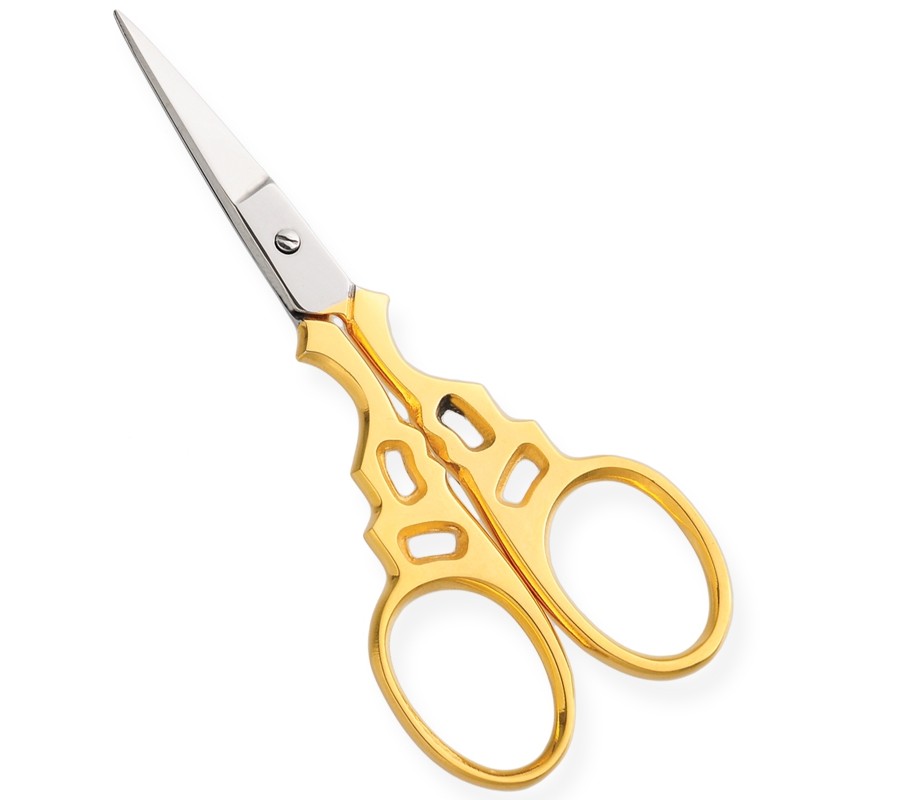 Embroidery Scissors Half Gold Platted Available Sizes. 3.5 in Details. All scissors are made of superior quality stainless steel 410, HRC° (hardness) 45° - 48°. Available in Blister Packing, Pouches and Plastic Bags.