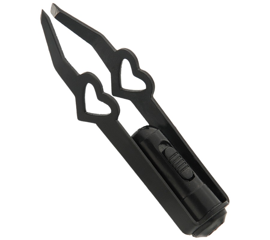 Plastic Handle Eyebrow Tweezers with Light Available Sizes. 10 cm Details. All tweezers are made of superior quality stainless steel J1/410, HRC° (hardness) 43° - 45°. Beautifully designed top quality stainless steel. This all purpose tweezers is ideal for facial hairs, bikini lines and other unwanted body hair. Available in slanted, straight and pointed tips